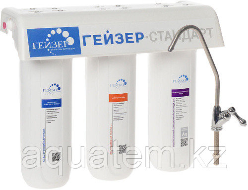 Гейзер Стандарт - трехступенчатый фильтр для очистки воды с повышенным содержанием солей жесткости. Фильтр Гейзер Стандарт очищает водопроводную воду от железа, взвешенных частиц, мутности, хлора, тяжелых металлов, органических соединений, примесей , избытка солей жесткости и др. Так же в этом фильтре имеется картридж БАФ, содержащий мультикомпонентную загрузку на основе сорбентов и ионообменных материалов.